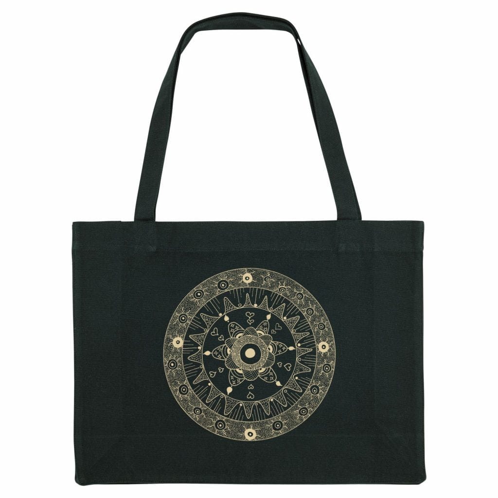 Fabricada con materiales ecológicos, es ligera, resistente y duradera, ofreciendo la combinación perfecta de estilo y funcionalidad. El diseño del mandala simboliza calma y conexión, convirtiendo esta bolsa en un complemento que va más allá de lo práctico, ofreciendo un mensaje de respeto y cuidado por el planeta.